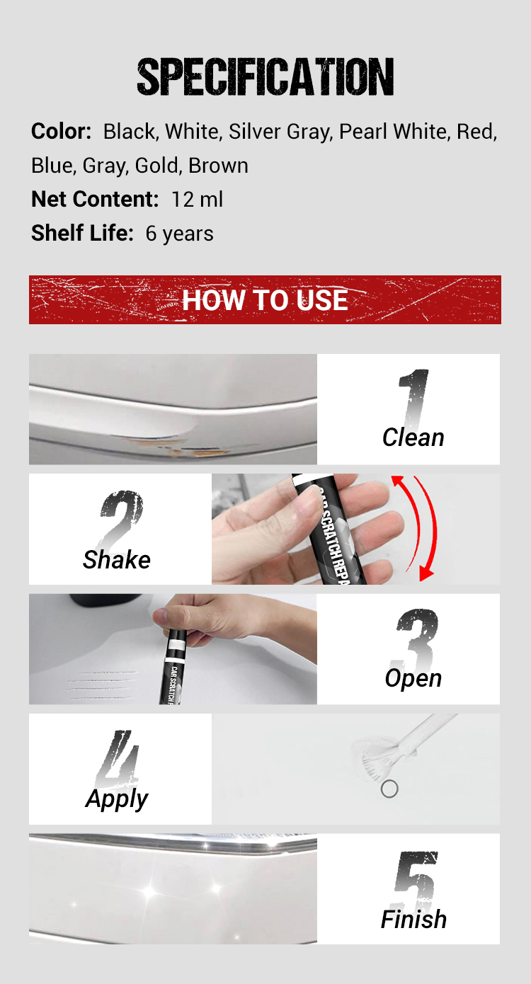 Say goodbye to costly paint jobs! Our Car Scratch Repair Pen is the quick, easy, and affordable solution to remove scratches, scuffs, and blemishes from your car’s surface. Designed with advanced nano-coating technology, this pen seamlessly blends with your car’s original paint, leaving a flawless finish in minutes.